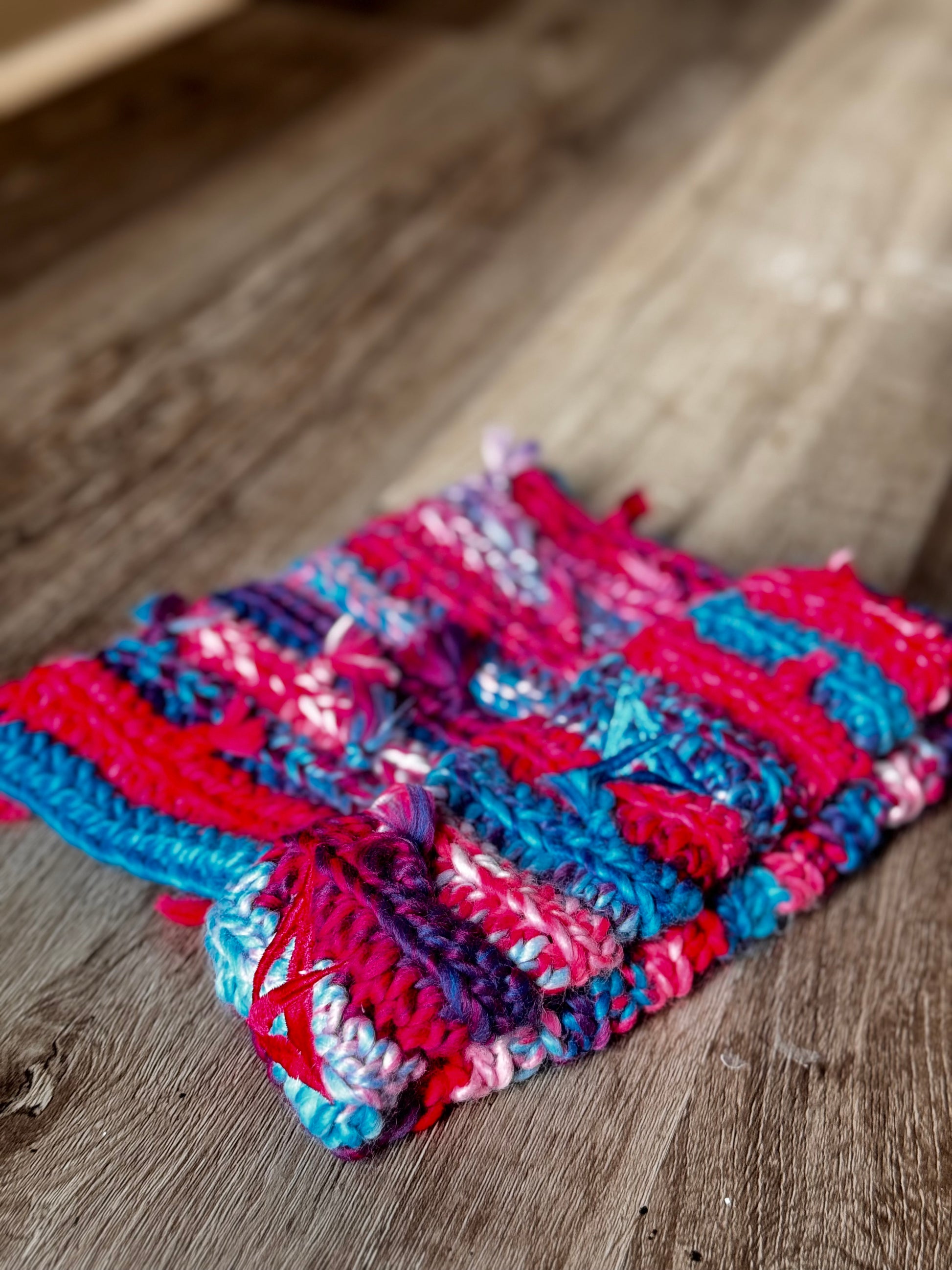 Handcrafted crocheted hat, with out infamous Logos around the fold. Bold colors such as shades of pink and blues…this hat has an ear type effect.